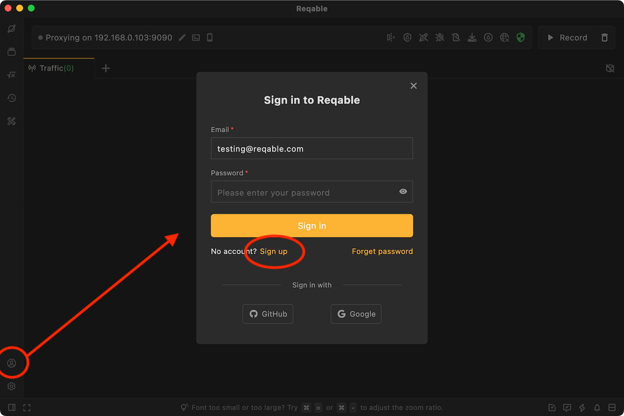 Download or update to the latest Reqable App, click the avatar in the bottom-left corner, and register an account using the same email address as your license (any registration method is fine). If you’ve already registered, you can skip this step. If you’ve registered but can’t sign in with a password, use Forgot Password to reset it.