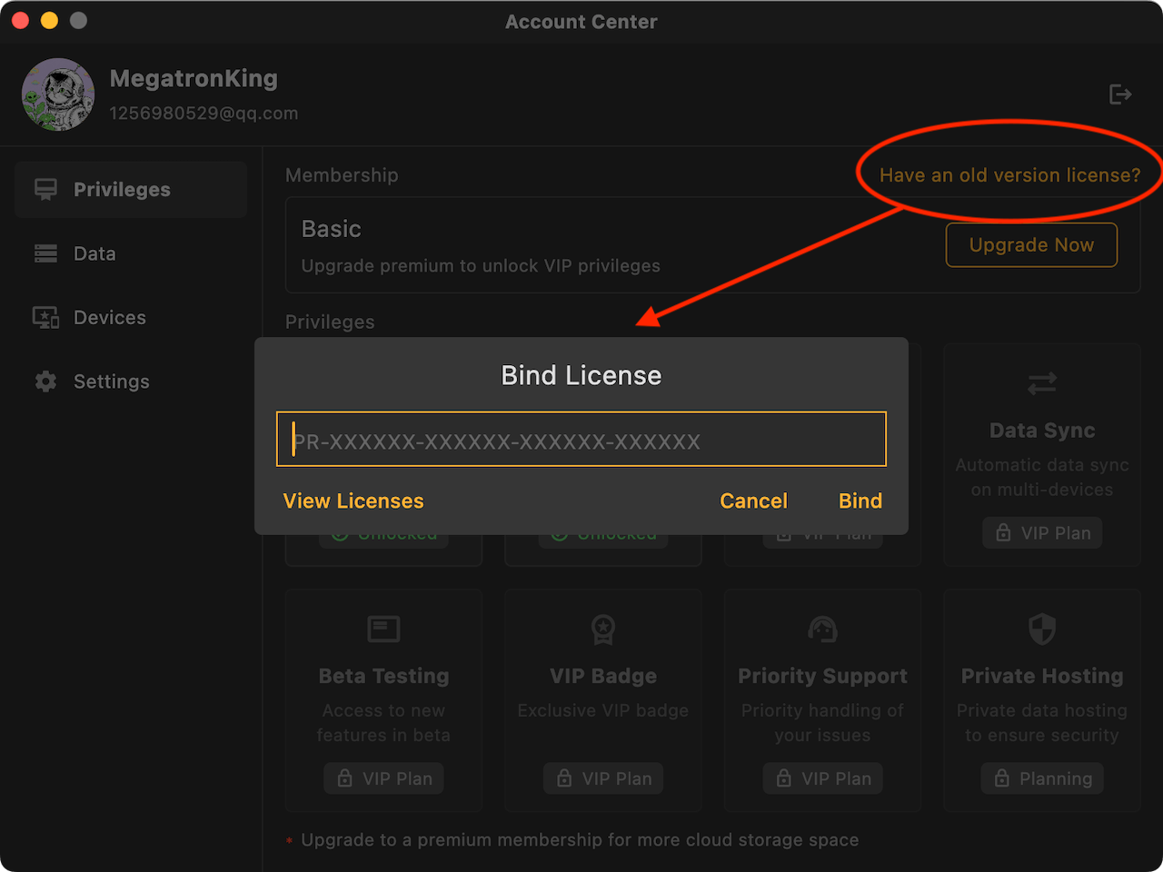 Starting from version 3.0, to support cloud data storage and multi-device sync, we rebuilt the membership system. The authorization has changed from license-based activation to account-based membership. If you purchased a license in an earlier version, you can migrate it to the new membership system. After migration, neither your validity period nor your benefits will be reduced.